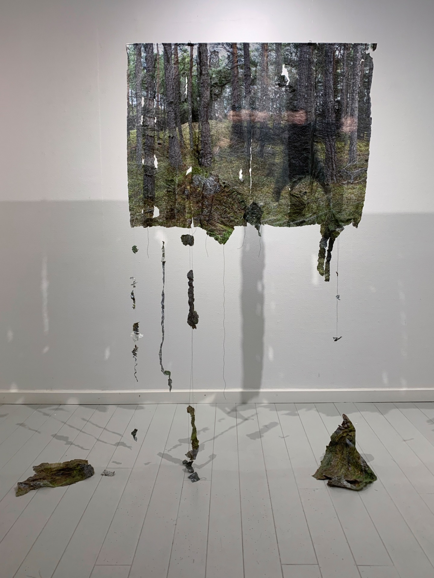 Pigmenttivedos Kozo-paperille, rypsiöljy, lanka, teksti